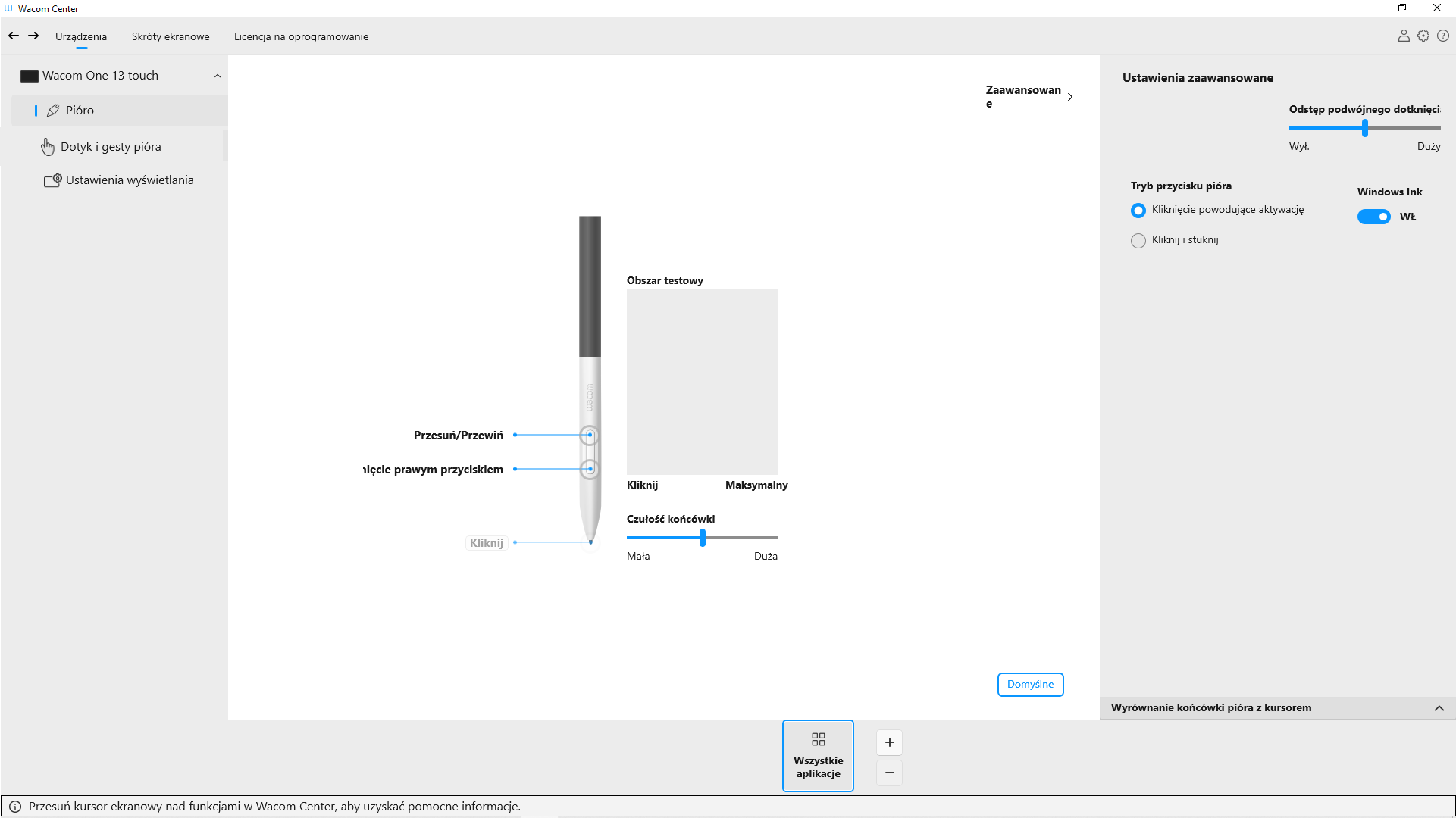 W Ustawieniach zaawansowanych można dodatkowo dostosować ustawienia nacisku końcówki pióra. Opcje w ustawieniach Zaawansowane umożliwiają niezależną zmianę czułości nacisku końcówki, ustawień progu kliknięcia, trybu przycisku pióra i nie tylko.