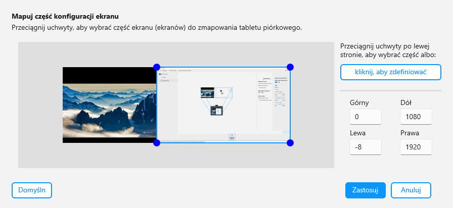 Jeśli masz kilka ekranów, urządzenie Wacom zostanie domyślnie zmapowane do wszystkich ekranów. Jeśli chcesz zmapować swoje urządzenie tylko do części obszaru ekranów, postępuj zgodnie z poniższymi instrukcjami.