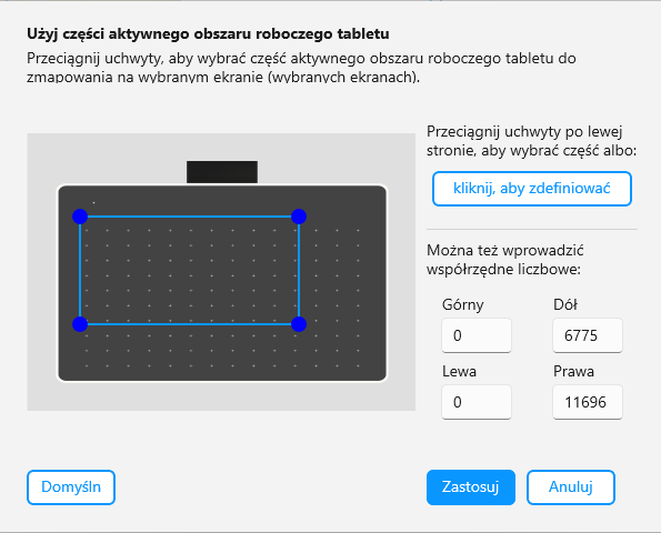 - W sekcji Przeciągnij uchwyty, aby przeciągnąć rogi niebieskiego pola w celu zdefiniowania aktywnego obszaru roboczego tabletu do zmapowania.