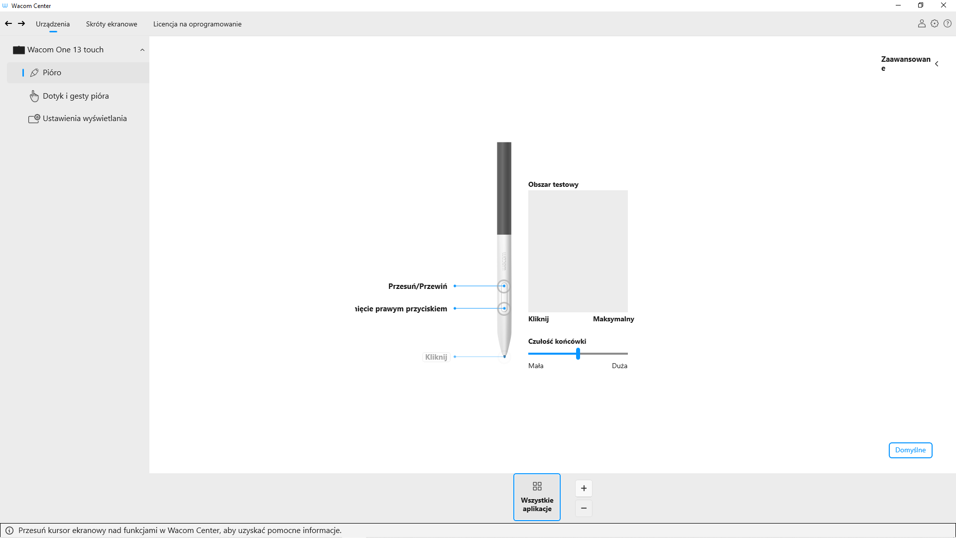 - Aby sprawdzić, z jaką siłą musisz naciskać piórem, sprawdź aktualny nacisk, naciskając końcówką pióra w Obszarze testowym.