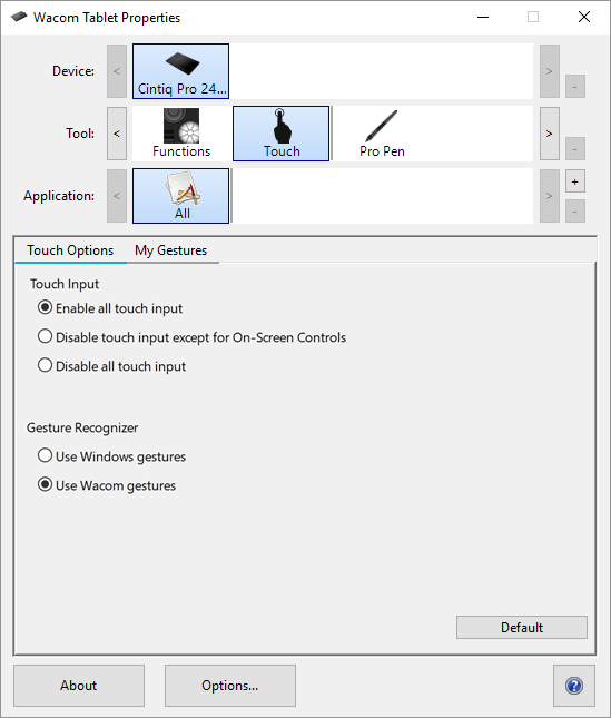 Dokunmatik seçenekleri, kalem ekranınızın temel dokunmatik işlevlerini kontrol eder. Windows'da, Touch Options (Dokunmatik Seçenekleri) ya da My Gestures (Hareketlerim) sekmesini seçin. macOS'te Standart Hareketler veya Hareketlerim sekmesini seçin.