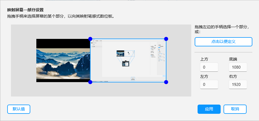 • 拖动蓝色边界的角,确定您想要与之映射的数位板的感应区域。