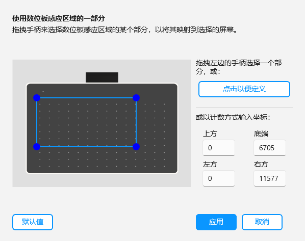 您可以指定设备的自定义感应区域。例如,如果您希望在电脑屏幕上绘制长线条但在设备上只需短短一笔,这项操作可能会帮到您。