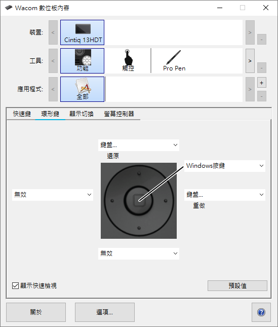 注意:要查看環狀鍵目前的設定,請選取環狀鍵索引標籤上的顯示快速檢視{核取方塊。然後輕按環狀鍵的四個位置或Home鍵中的任何一個,即可在螢幕上查看目前的設定。