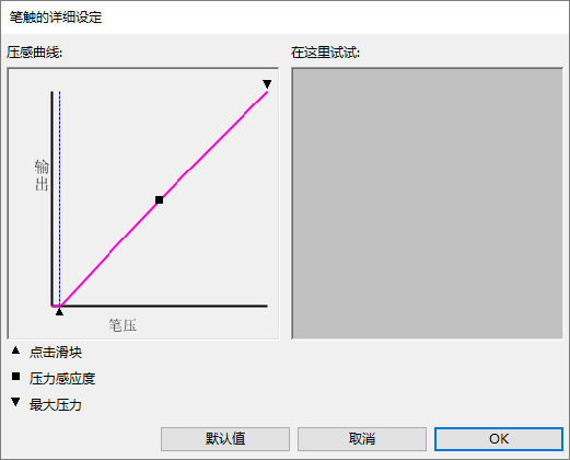 注意:在“笔”和“橡皮擦”选项卡中,压力和敏感度设置也可通过笔尖感应或橡皮擦感应下的滑块调节,但这会覆盖“笔触的详细设定”对话框中的压力感应曲线设置。