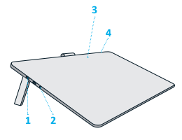 - 折りたたみ式の脚:液晶ペンタブレットを見やすい角度で支えるように脚を広げます。角度を低くするには脚を折りたたみます。